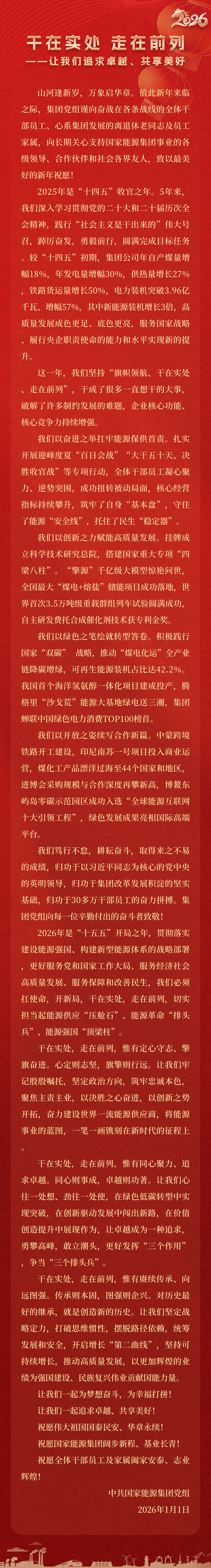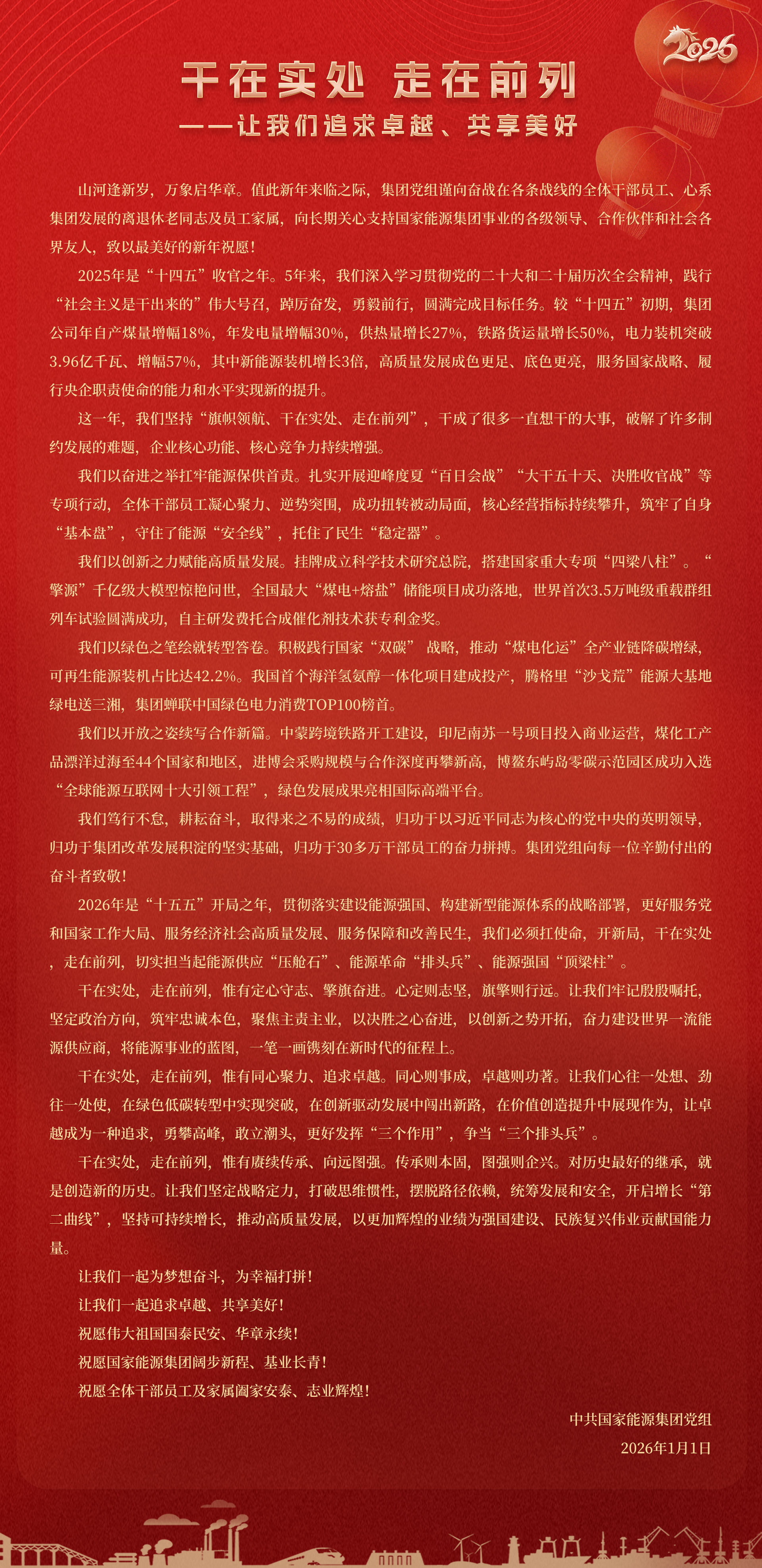 國家能源集團胸懷“國之大者”,增產增供、穩(wěn)價穩(wěn)市,積極服從服務國家戰(zhàn)略、保障國家能源安全、助力國民經濟穩(wěn)增長,推動煤炭安全綠色智能、煤電清潔高效穩(wěn)定、現(xiàn)代煤化工高端多元低碳、運輸物流協(xié)同一體、新能源多元創(chuàng)新規(guī)模化發(fā)展,全力擔當能源強國頂梁柱,能源供應壓艙石,能源革命排頭兵。